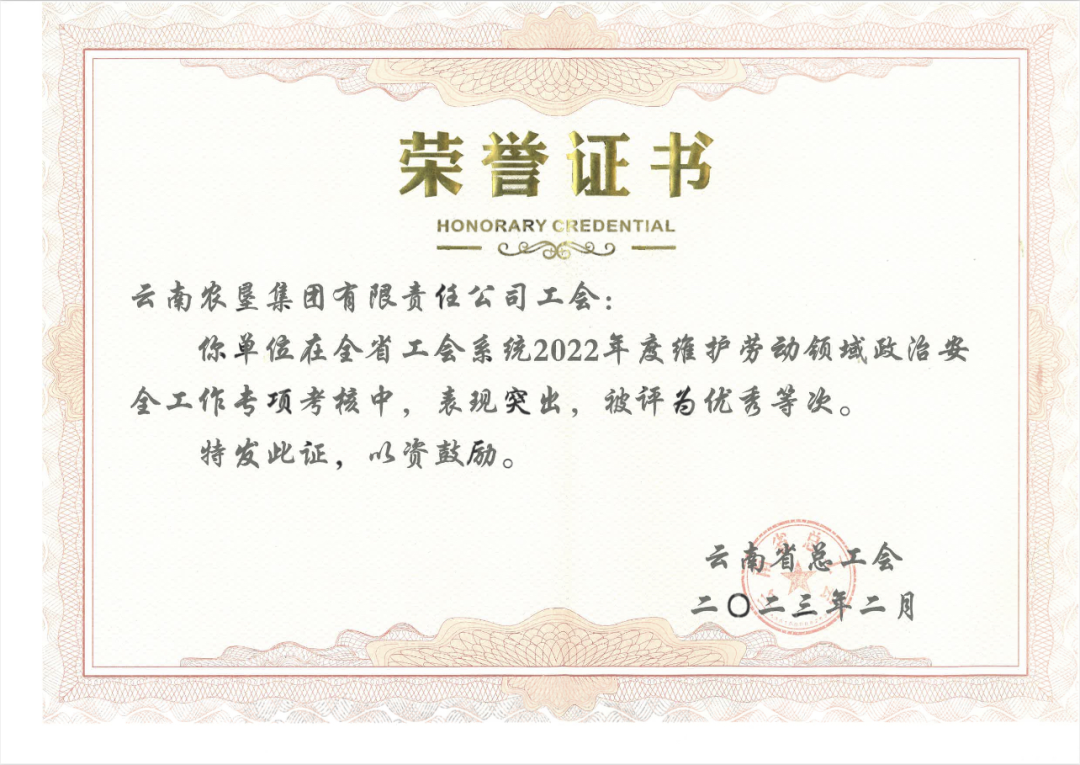 集团在2022年云南省总工会维护劳动领域政治安全考核中获评优秀等次